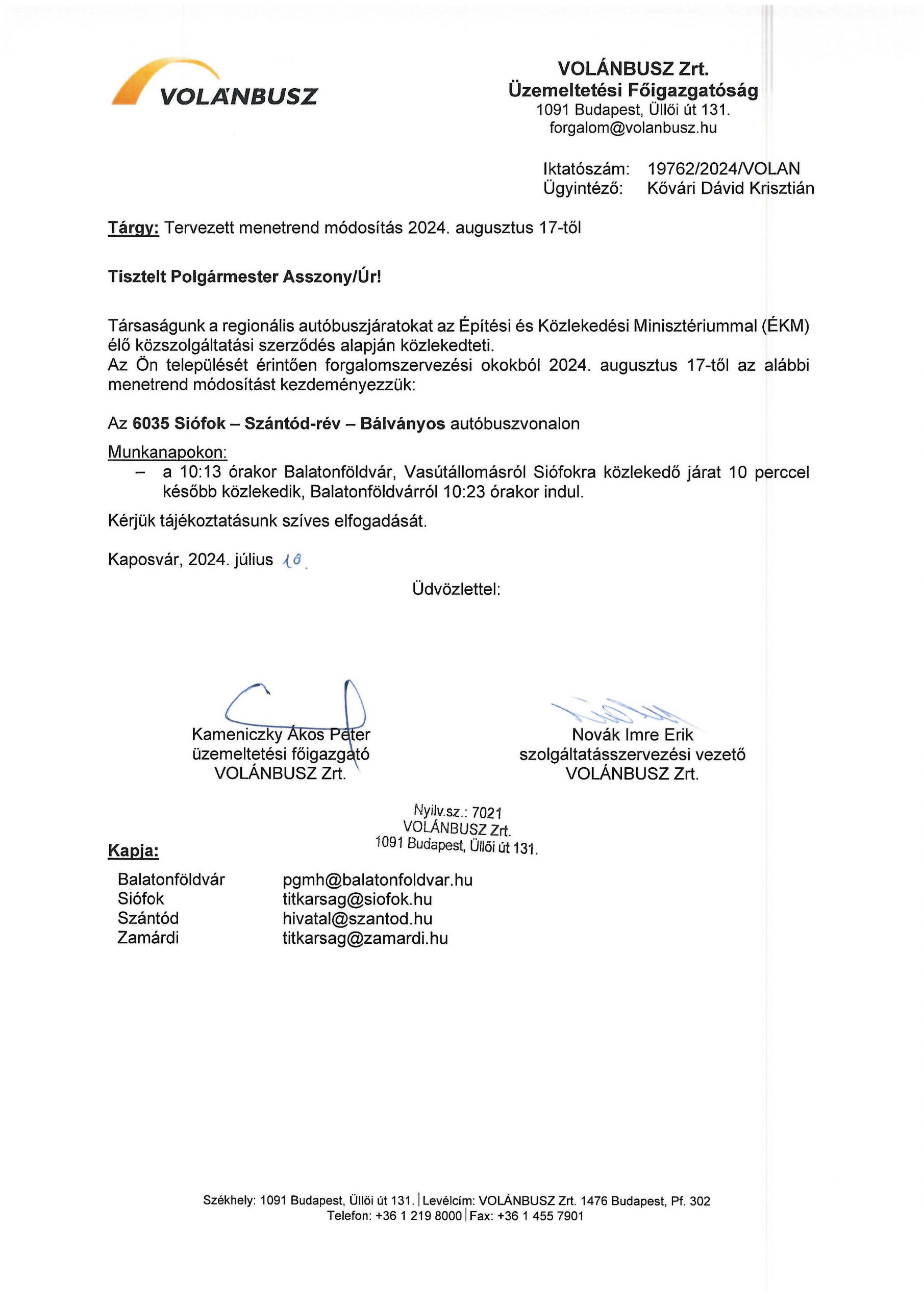 Busz menetrend változás – Siófok – Bálványos vonalon