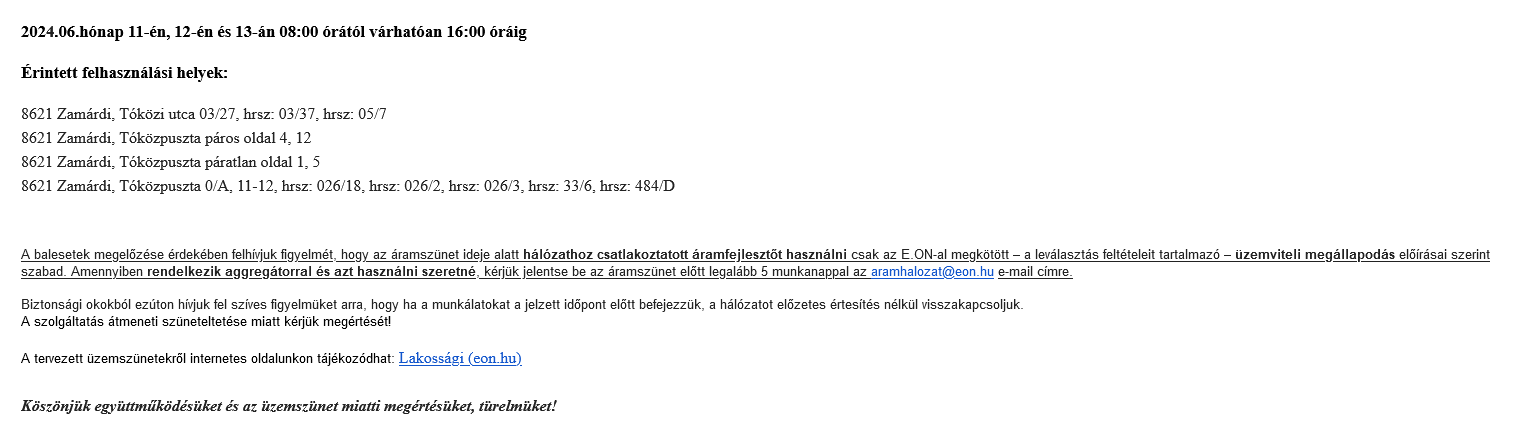 Figyelem! Áramszünet tóközpusztán június 11-12.